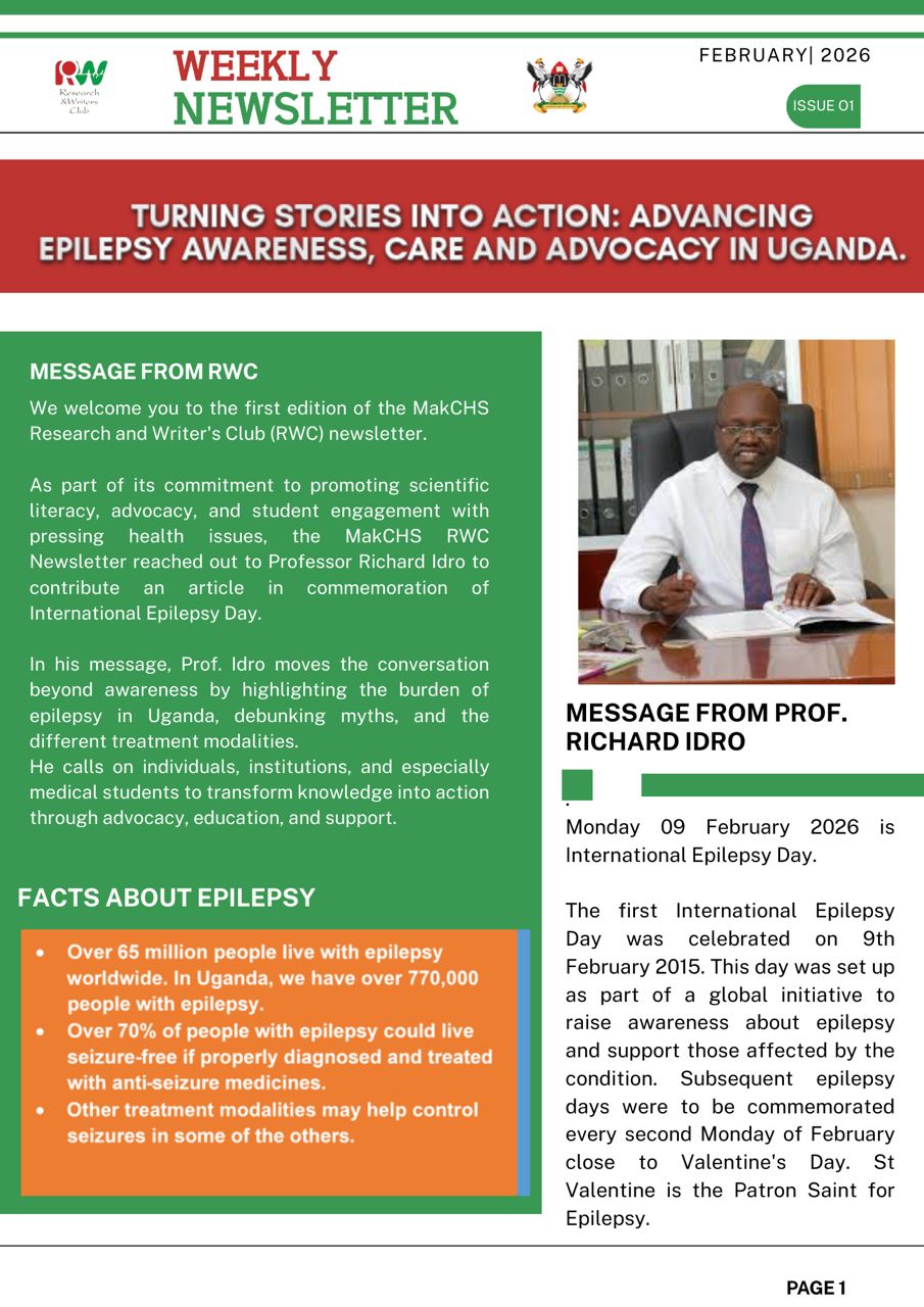 The Makerere University College of Health Sciences (MAKCHS) Research and Writers’ Club (RWC) has released the first edition of its Weekly Newsletter, focusing on epilepsy awareness, care, and advocacy in Uganda.