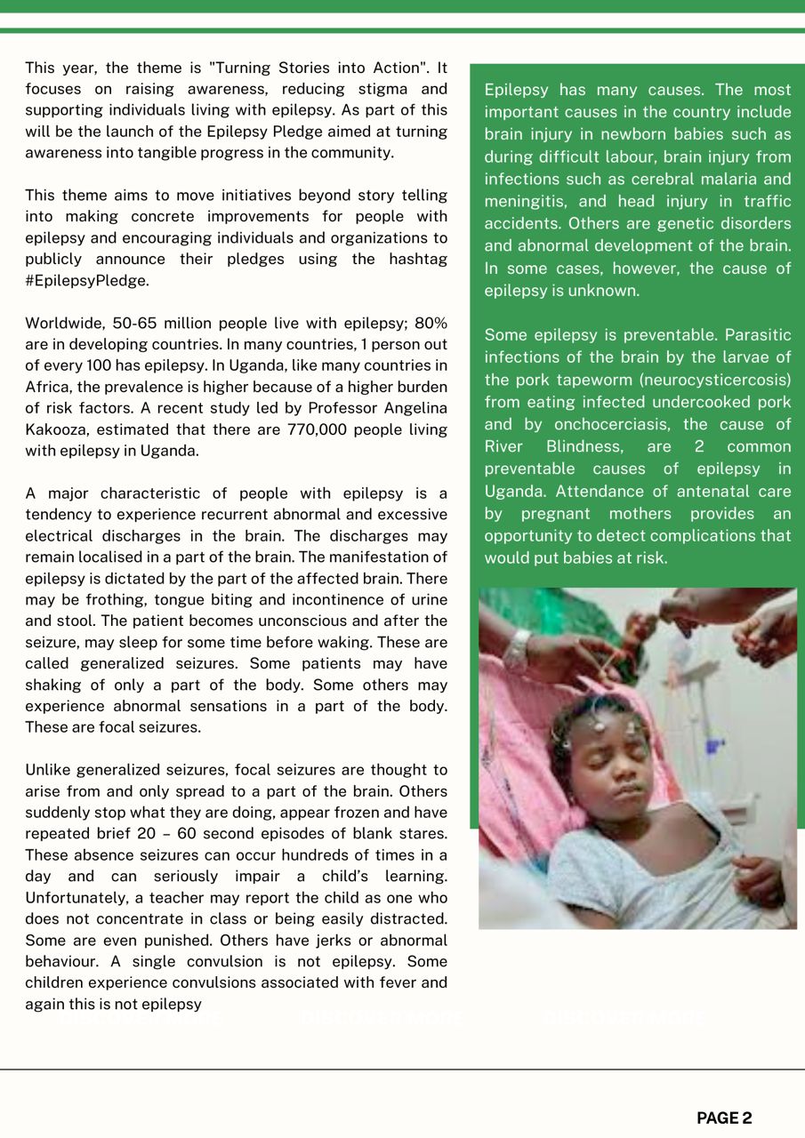 This inaugural issue features a message from Professor Richard Idro, highlighting the burden of epilepsy in Uganda, addressing common misconceptions, and emphasizing the importance of timely diagnosis and appropriate treatment. The newsletter calls on individuals, institutions, and medical students to translate knowledge into action through advocacy, education, and community support.