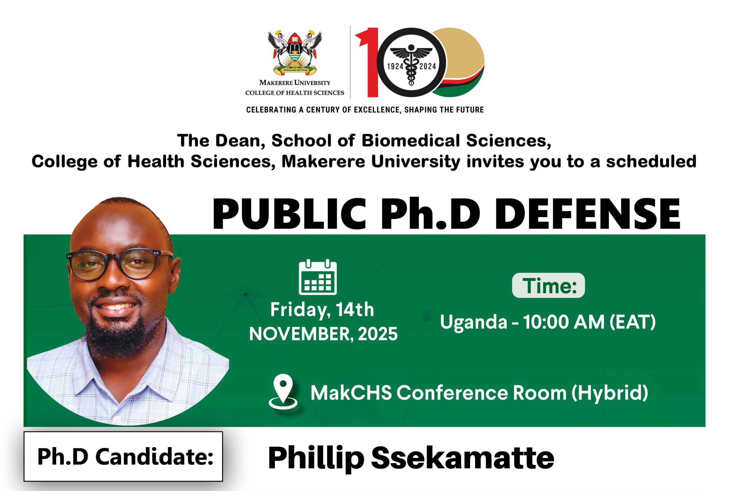 The Dean, School of Biomedical Sciences, Makerere University College of Health Sciences, invites you to be part of Phillip Ssekamatte’s Public PhD Defense, scheduled for Friday, 14th November 2025, at 10:00 AM (EAT). See details below: