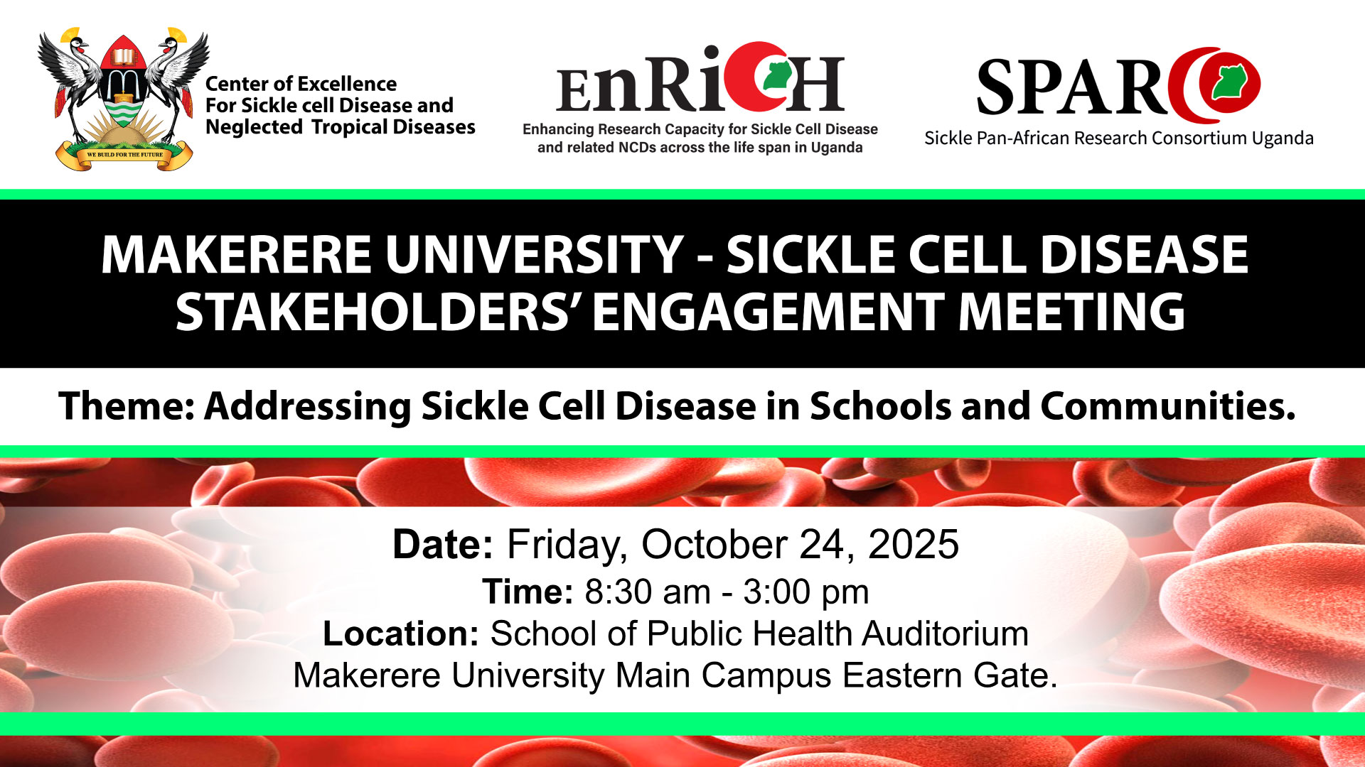 Makerere University, in collaboration with the Centre of Excellence for Sickle Cell Disease and Neglected Tropical Diseases, EnRiCH and SPARCO, invites stakeholders from education, health, civil society, and community organisations to a one-day engagement meeting focused on tackling sickle cell disease (SCD) in school and community settings. The meeting will bring together clinicians, researchers, educators, policy makers, caregivers and patient representatives to share knowledge, discuss challenges and identify practical strategies for improving care, awareness and support systems.